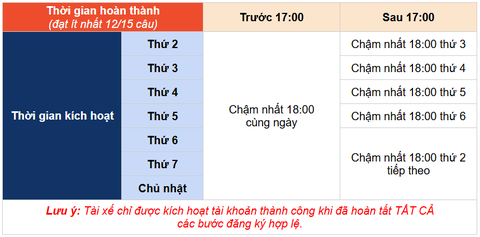 Tài xế mới đã hoàn tất thủ tục hợp tác và hoàn thành bài kiểm tra với mức điểm đạt từ 12/15 điểm.